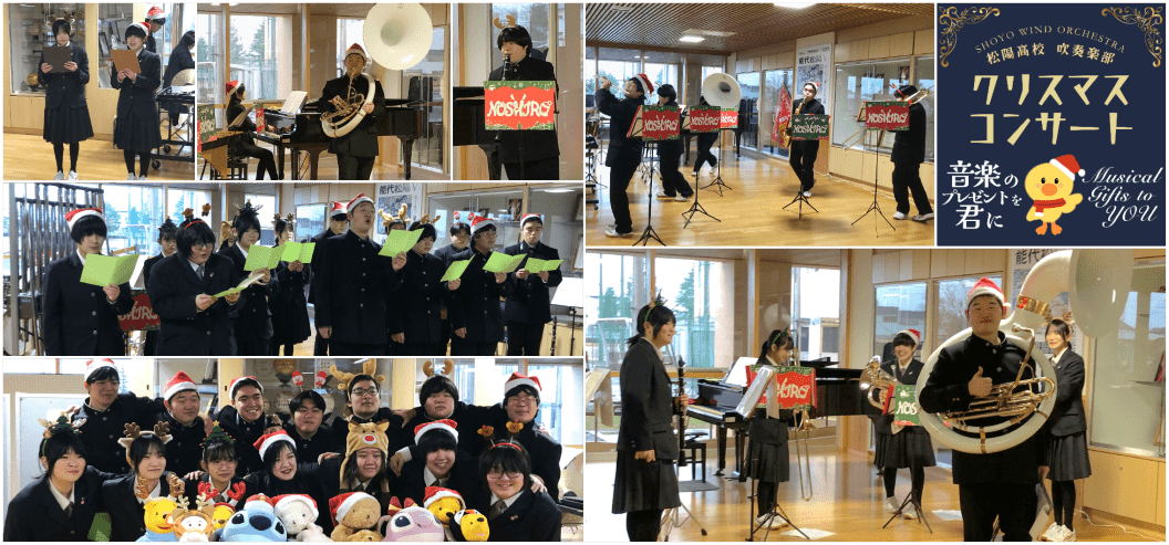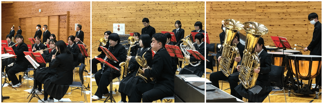 「1番楽しい演奏を!」を密かなモットーに、能代高校と能代科学技術高校と共に、能代山本地区の代表バンドとして演奏を披露してきました。当日は指揮者もサンタ衣装に身を包み、バンド全体がクリスマス一色に染まります。「Xmasメドレー~童謡Ver.~」と「宝島」の2曲を明るいサウンドで演奏し、クリスマス前日のステージを華やかに彩りました。