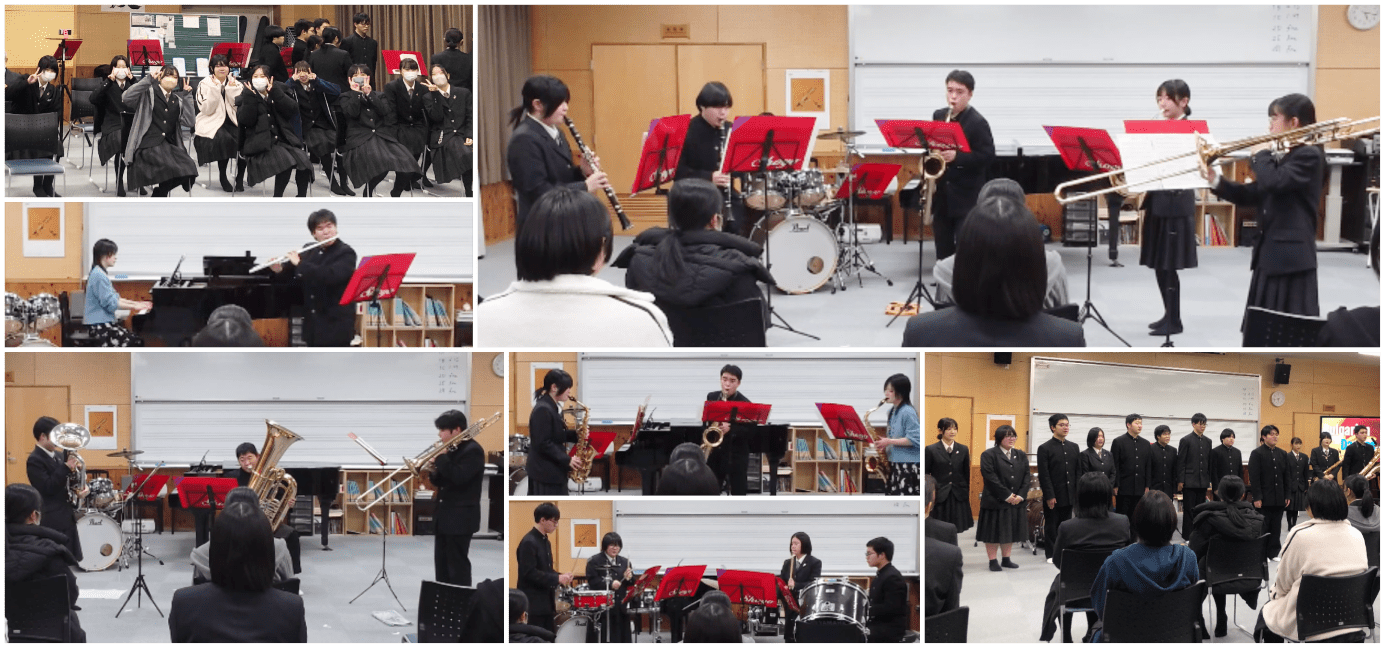多くの先生方と3年生の先輩たちが見守る中、4チームのアンサンブルと、個人練習に励んだ1名のソロを披露しました。大いに緊張した様子も見られましたが、本番のステージを見据えて果敢に演奏に臨んでいました。より積極性をもって演奏できるよう、今後も仲間を信じて練習に取り組んでいきましょう。